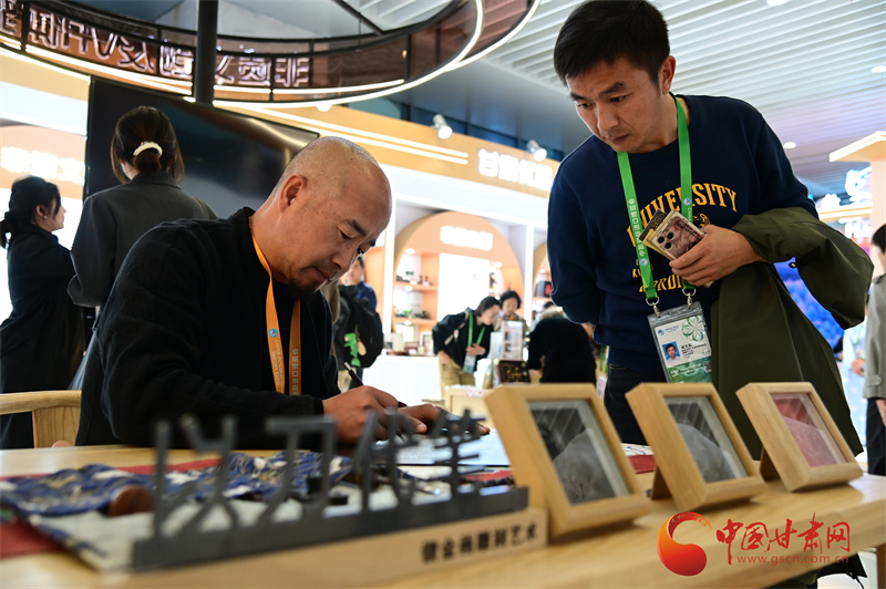 展廳里,除了靜態(tài)展示的鍥金畫,還有手工藝人現(xiàn)場演示刻刀的用法——觀眾能看著鋼刀在底板上游走,看線條一點點成型,感受每一刀背后的細(xì)致與耐心。旁邊的VR體驗區(qū),通過折幕投影帶觀眾“走進”莫高窟,也讓大家更懂張兆武筆下敦煌元素的由來;“美食薈”里的蘭州牛肉面、“文藝薈”里的特色工藝,則從旁襯托著這門非遺手藝的文化底色。