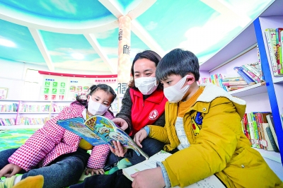 江蘇省海安高新區(qū)文化志愿者在農(nóng)家書(shū)屋里與留守兒童一起閱讀兒童讀物。翟慧勇攝/光明圖片