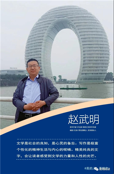 懷瑾握瑜,勤耕不輟。趙武明的寫作是安靜的,由于從事20余年的新聞工作,給他貯存了很多素材,所以他涉獵的寫作范疇很廣,寫散文隨筆、文藝評論、紀(jì)錄片、微電影、大型晚會(huì)總撰稿,還研究網(wǎng)絡(luò)文學(xué)。如果說文字是會(huì)呼吸的,趙武明的文字除了唯美,更多的是硬骨錚錚,也不乏柔腸的峻厲和倬約,風(fēng)姿獨(dú)具,淡雅濃烈,相得益彰,簡約獨(dú)立,一語千里,蘊(yùn)含張力。他常說,寫作要穿透人心抵達(dá)靈魂。向外,不斷追求生命更高的境界;向內(nèi),不斷觸及心靈。