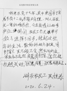 吳桂春:這句標(biāo)語我現(xiàn)在聽你說,才知道是誰的題詞,怪不得圖書館里的顯著位置都有“知識惠東莞”這句話。當(dāng)時覺得只要在圖書館辦一張借閱證,我這種外來民工也能進(jìn)來看書。書籍對每一個人來說都是公平的,不管誰看,都能得到實(shí)惠,知識也能惠及外來民工。