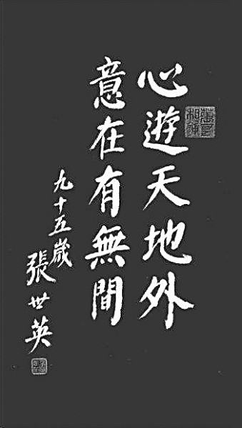 張先生今年正好百歲,照過去的觀念,當然是長壽了。但是在我們的心目中,張先生現(xiàn)在去世,還是太早了,令我們無限悲痛!前年(2018年)12月18日,《張世英書法集》出版,我們在燕南園56號院舉行新書沙龍。張先生在會上講話,講得那么好,講得那么清晰,一個字不多,一個字不少。當時張先生已是98歲高齡了。在開會前我和張先生聊天。我說:“我感到學(xué)哲學(xué)能使人長壽。”張先生說:“我同意你的看法。”為什么學(xué)哲學(xué)能使人長壽?就因為哲學(xué)學(xué)得好,能使人有高遠的精神境界,就是張先生書法集里這兩句話:“心游天地外,意在有無間。”這種高遠的精神境界,必然使人長壽。大家常說:“期之以米,望之以茶。”當時張先生已經(jīng)過了米壽,我們相信他必然健康地走向茶壽?,F(xiàn)在卻突然去世,不是太早了嗎?