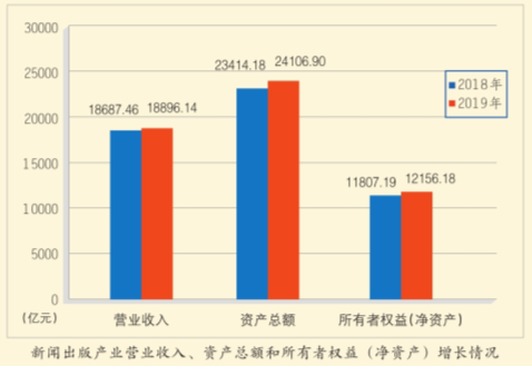 國家新聞出版署日前發(fā)布《2019年新聞出版產(chǎn)業(yè)分析報告》《2019年全國新聞出版業(yè)基本情況》。數(shù)據(jù)顯示,2019年,新聞出版產(chǎn)業(yè)規(guī)模繼續(xù)增長。全國出版、印刷和發(fā)行服務(wù)實(shí)現(xiàn)營業(yè)收入18896.1億元,較2018年增長1.1%;擁有資產(chǎn)總額24106.9億元,增長3.0%;所有者權(quán)益(凈資產(chǎn))12156.2億元,增長3.0%。
