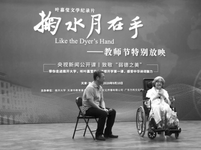 九月十日教師節(jié),南開(kāi)大學(xué)舉辦《掬水月在手》影片首映式。葉嘉瑩先生是國(guó)際儒聯(lián)榮譽(yù)顧問(wèn),我銜命陪同王念寧副會(huì)長(zhǎng)專(zhuān)程赴南開(kāi)致賀,有幸在南開(kāi)禮堂聆聽(tīng)九十六歲高齡的迦陵先生與白巖松共話詩(shī)意人生。迦陵先生坐在輪椅上娓娓道來(lái),鬢發(fā)皤然,聲如洪鐘,風(fēng)華絕代。