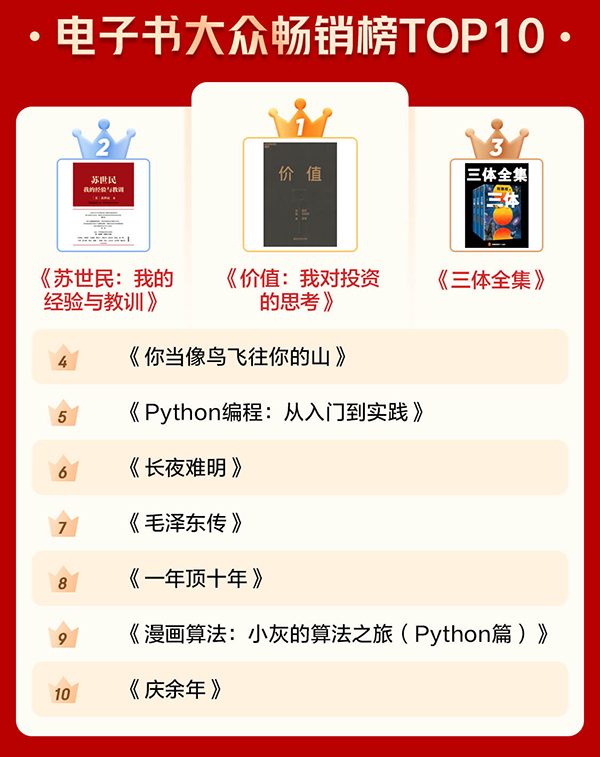 通過電子書暢銷榜TOP10和有聲暢銷榜TOP10可以看出,很多人愈發(fā)關(guān)注投資和管理等方面的內(nèi)容,也愈發(fā)注重個人學(xué)習(xí)。《價值:我對投資的思考》《蘇世民:我的經(jīng)驗與教訓(xùn)》 分別位居電子書暢銷榜第一名和第二名?!吨袊?jīng)濟(jì)2020》《原則》進(jìn)入有聲暢銷榜前十。此外,學(xué)習(xí)類圖書《Python編程:從入門到實踐》《漫畫算法:小灰的算法之旅(Python篇)》也上榜電子書暢銷榜前十。