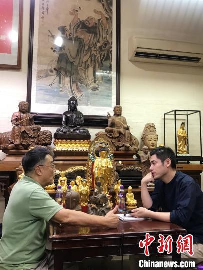 圖為葛亮(右)采訪澳門(mén)木雕佛像非遺傳承人 人民文學(xué)出版社供圖