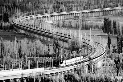 伴隨改革開放大潮,中國(guó)發(fā)展日新月異,高鐵、快遞、“天眼”望遠(yuǎn)鏡、粵港澳大橋等新事物都被詩(shī)人們?nèi)谌朐?shī)行。圖為行駛中的蘭新高鐵列車。新華社發(fā)(蔡增樂(lè)攝)