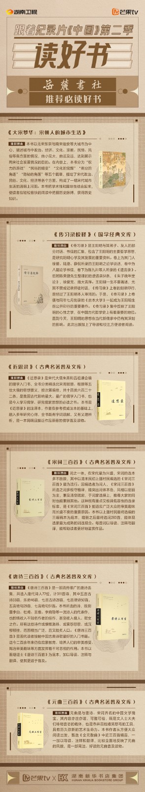 紅網(wǎng)時刻3月7日訊(通訊員 王平)紀(jì)錄片《中國》第二季每周一至周四19點(diǎn)30分,芒果TV、湖南衛(wèi)視正在熱播,為了更好地傳播中國故事,讓不朽人物和偉大思想突破影像空間的限制,可知、可感、可觸地融入日常生活,芒果TV聯(lián)合湖南新華書店集團(tuán),攜手中華書局、上海古籍出版社、岳麓書社共同推出“跟著紀(jì)錄片《中國》第二季讀好書”推薦活動,共享閱讀,鏈接美好生活,傳遞人文情懷。