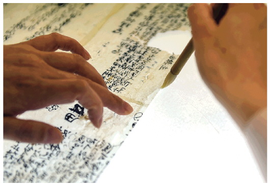 ▲5月17日,在安徽博物院文物科技保護中心紙質(zhì)文物修復(fù)室,工作人員對古籍文物進行補全。新華社記者周牧攝