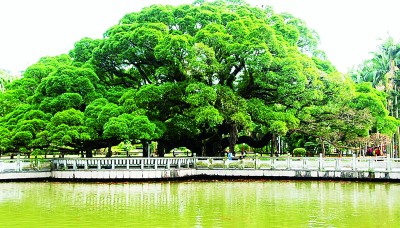擁有古樹的城市就是擁有歷史的城市。福州古榕遍布,四季常青,是城市、市民生活與樹木的完美結(jié)合,是風(fēng)景的自然生長,是歷史根深葉茂地屹立。福州古榕以樹齡長、歷史久、數(shù)量眾而著稱。見證福州城市史的,當(dāng)首推鼓山國家森林公園、八一水庫旁,福州無人不知的已近千歲,被譽(yù)為福州榕樹王的古榕。相傳,這棵古榕是張伯玉所栽植的兩棵樹苖,光陰荏苒,同氣相求,如今兩棵榕樹相互糾結(jié)、勾連、纏繞、親密,已無分彼此。其冠幅達(dá)1300米,可容納千人在樹下談古論今,聊天遮陰。遠(yuǎn)望,似綠色陵巖;近看,知其為榕也,密密的枝葉把近午的陽光切割成碎花點(diǎn),散落、閃亮在榕樹下的草坪和地衣上。初訪者或為訝異:偌大一棵古榕卻不見氣根,知榕者會告訴你,這是一株碩大、古老而不生氣根的細(xì)葉榕。因其冠幅日益長大,為了支撐沉重的樹冠、預(yù)防主干折損,便制作了若干石柱,砥柱其間。古榕下有湖塘,錦鯉游泳,不時生出紅色漣漪。旁有一碑,上刻:榕蔭照水波心漾,觀魚猶勝花間行。