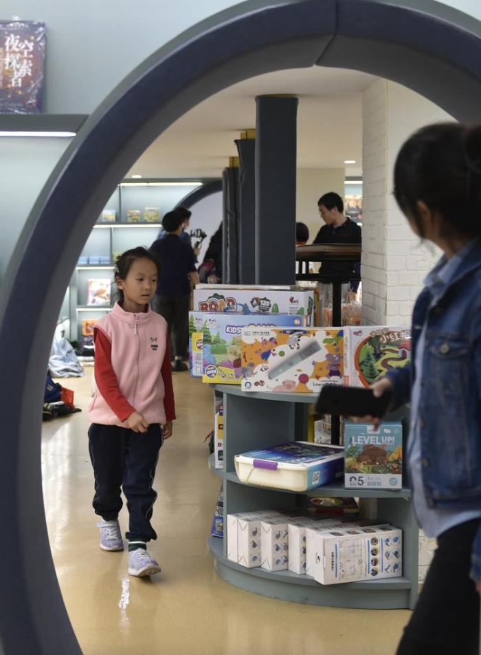 10月18日,家長帶著小朋友在鄭州市緯五路第一小學(xué)校園閱讀中心內(nèi)閱讀。
