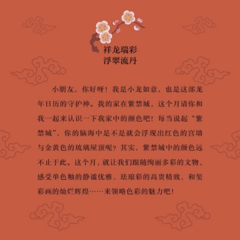 媽媽告訴如意,這是一個(gè)“時(shí)光寶盒”,里面有來自故宮不同領(lǐng)域的10位專家從故宮館藏中精選的262件“龍”文物,它們每天登場介紹自己的故事,還會(huì)請(qǐng)小讀者幫忙,每日動(dòng)手給日歷中的小龍如意卷軸貼出一身漂亮的龍鱗。