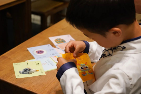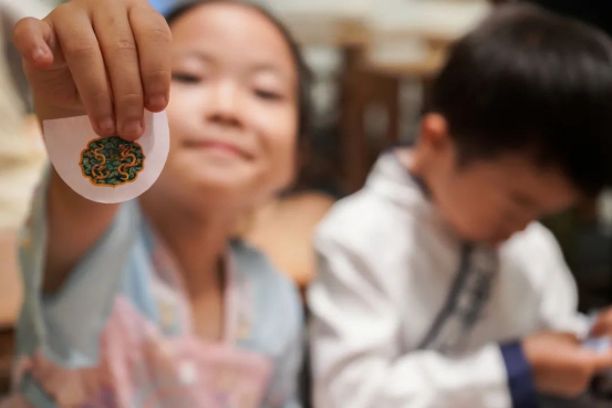 每個(gè)龍文物故事上方,也印有當(dāng)天文物的小圖,它周圍伴有一圈半圓打孔的攏線。如意用小手沿著攏線輕輕一摳,一片小小的“龍鱗”就落在了手心。原來,它就是今天的“成長值”啊。
