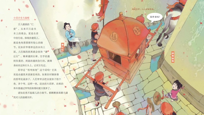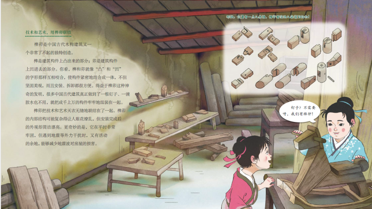 書中提到了在墻面削個(gè)角、弄個(gè)彎,“拐彎抹角”、方便大家行走的謙讓智慧;齊心協(xié)力,共同出資出力蓋房子的和諧智慧;技術(shù)和藝術(shù)并存,用榫卯聯(lián)結(jié)構(gòu)件的建構(gòu)智慧;防患于未然,保證人們生命、生活安全的防患智慧……