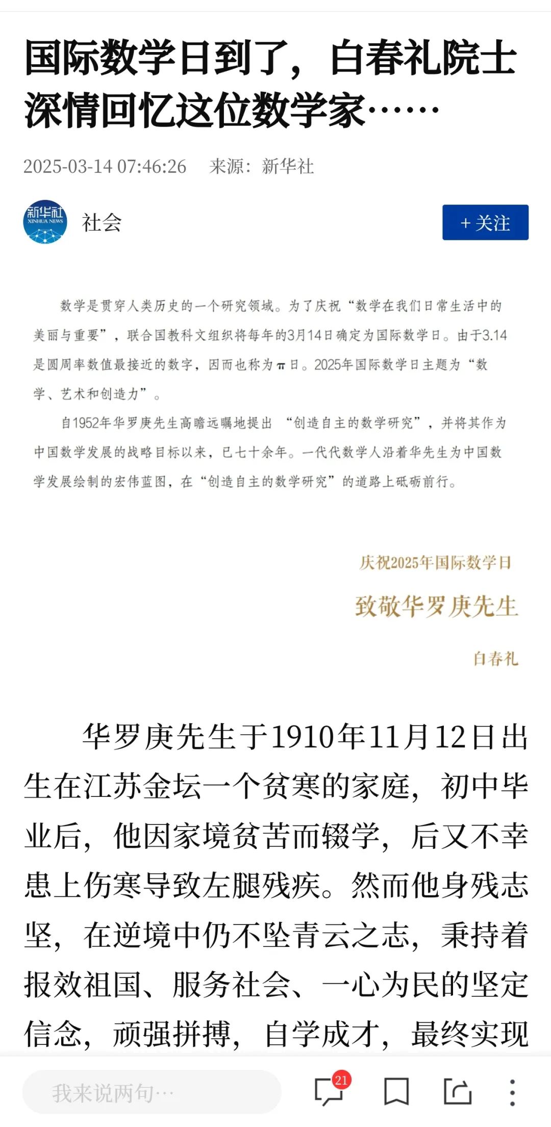 新版問世后,白春禮院士在新華社撰文《國(guó)際數(shù)學(xué)日到了,白春禮院士深情回憶這位數(shù)學(xué)家......》力薦本書,獲超150萬閱讀量。