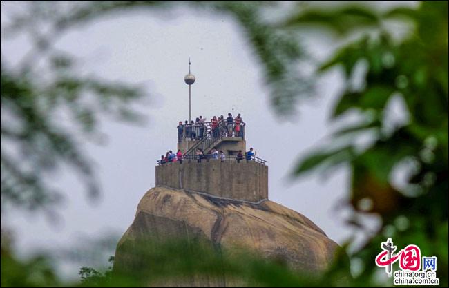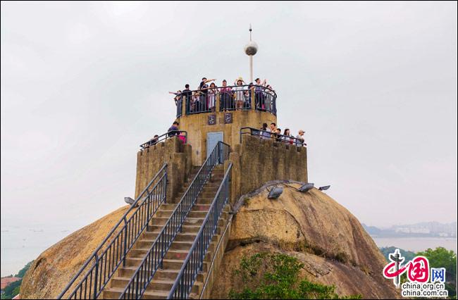 說(shuō)到自然風(fēng)光,便不能不提日光巖——這島上的最高峰。日光巖別名“晃巖”,相傳1641年,鄭成功來(lái)到此地,見(jiàn)此地風(fēng)景勝過(guò)吉林日光山,便把“晃”字拆開(kāi),稱之為“日光巖”。要登臨此巖,一窺日光,便要辛勞走一段山路。其間渾圓的巨石層出不窮,蒼郁的古樹(shù)隨處可見(jiàn),更有閩南大厝、名人題字與這些自然風(fēng)景相得益彰。于是游人往往在心曠神怡中,路過(guò)“九夏生寒”“鷺江龍窟”,經(jīng)由“閩海雄風(fēng)”“古避暑洞”,不知不覺(jué)間,來(lái)到巖頂?shù)钠脚_(tái)。立定此處,憑欄遠(yuǎn)望,只見(jiàn)輕靈的云天近在咫尺,島上的屋宇盡收眼簾——別提有多么愜意!難怪有詩(shī)人寫(xiě)道:“一葉輕舟破霧霾,波濤滾滾此登臺(tái)。日光巖上憑欄望,隔岸清風(fēng)過(guò)海來(lái)。”(陳仁德句)