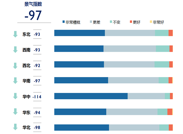 《報(bào)告》稱,受疫情影響,全國(guó)各地對(duì)于旅游到訪目的地的景氣預(yù)期同樣極度消極,7大地區(qū)市場(chǎng)的平均景氣指數(shù)跌至-97。其中,受疫情影響最為嚴(yán)重的華中地區(qū)景氣指數(shù)最低。同樣的,目的地景氣指數(shù)也表現(xiàn)出疫情影響越嚴(yán)重,指數(shù)表現(xiàn)越低的趨勢(shì)。