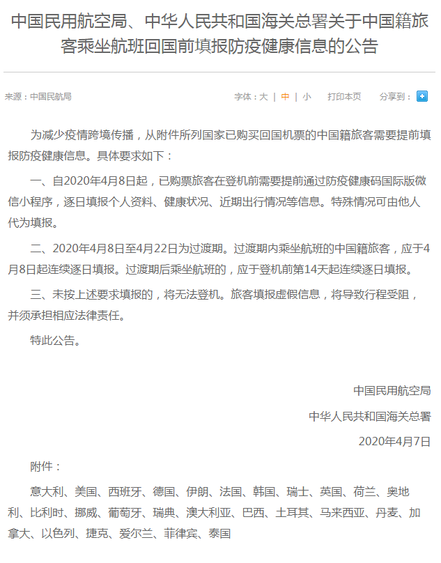 中國民用航空局、中華人民共和國海關(guān)總署4月7日聯(lián)合發(fā)布《關(guān)于中國籍旅客乘坐航班回國前填報防疫健康信息的公告》(以下簡稱《公告》)?!豆妗分赋觯?/span>自4月8日起,從意大利、美國、西班牙等26個國家已購買回國機(jī)票的中國籍旅客需要在登機(jī)前提前填報防疫健康信息,包括逐日填報個人資料、健康狀況、近期出行情況等。旅客未按要求填報的,將無法登機(jī);填報虛假信息,將導(dǎo)致行程受阻,并須承擔(dān)相應(yīng)法律責(zé)任。