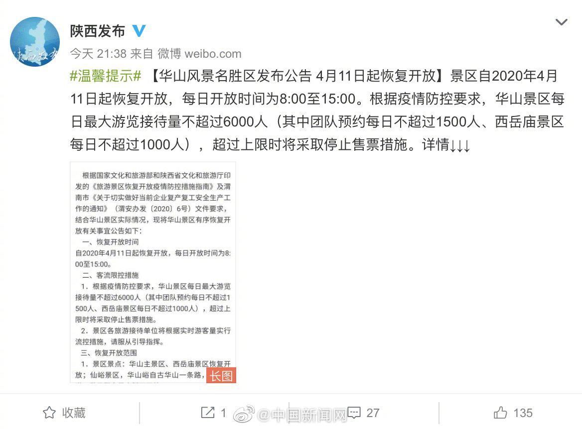 華山風(fēng)景名勝區(qū)4月9日發(fā)布公告,宣布華山風(fēng)景區(qū)4月11日起恢復(fù)開放。據(jù)@陜西發(fā)布 華山風(fēng)景名勝區(qū)發(fā)布公告稱,自2020年4月11日起恢復(fù)開放,每日開放時(shí)間為8:00至15:00。