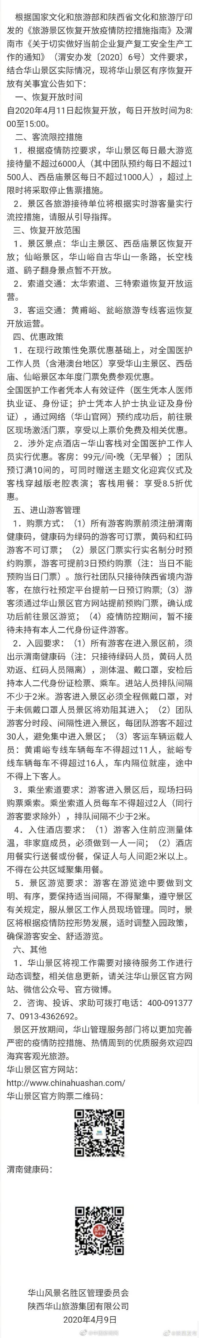 原標(biāo)題:華山風(fēng)景區(qū)11日起恢復(fù)開放 對(duì)醫(yī)護(hù)人員免門票