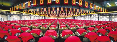 來到養(yǎng)酒館的三樓,這里儲存了大量的陶壇,它們整齊有序地?cái)[放著,在陶壇上面懸掛著徽縣歷史上幾十家著名的老字號釀酒作坊的名號。“不要小看這些陶壇,它們里面可裝著金徽的‘寶貝’。”講解員說,這里面承裝著金徽的老酒,也是高端酒。每一壇都有標(biāo)簽,注明了年份。