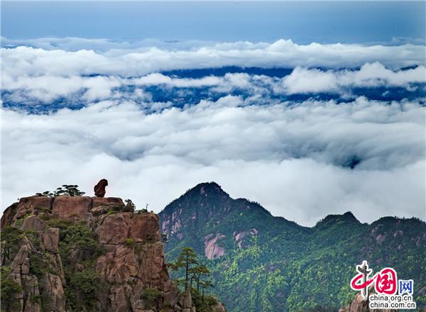 云海是黃山美景的精髓與靈魂所在,如上帝的神來之筆,賦予了黃山深邃含蓄的意境。黃山植被覆蓋率高,溫潤的水汽常年縈繞,跟著風(fēng)游走,或聚或散,或濃或淡。云衫映幽山,薄霧罩峰巒,疑似仙境銀河墜落人間。