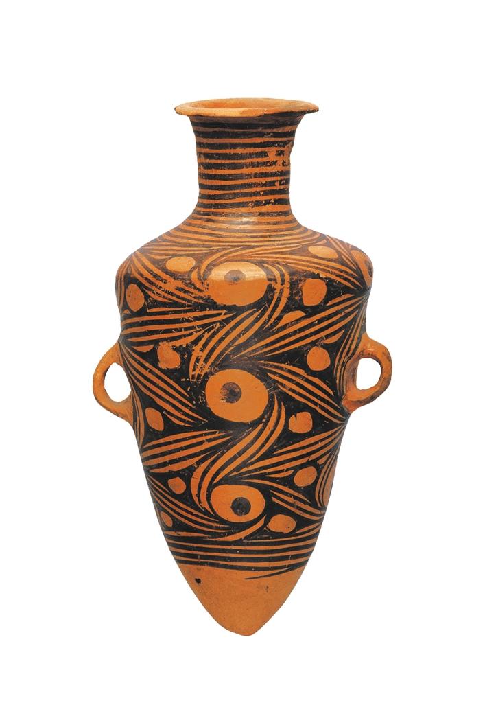 馬家窯文化半山類型(距今約 4500 年),廣河縣地巴坪出土。這是雙耳甕器型大氣貴重,施以紅、黑二彩,紅、黑彩交替使用,腹部繪多層連續(xù)垂弧紋和鋸齒紋,黑、紅彩交替使用,由三組分層連續(xù)的垂弧紋組成整體圖案,每層由兩層黑色帶紋和一層紅色帶紋組成,黑色帶紋上緣繪向上的鋸齒紋。整個(gè)圖案密集繁復(fù),俯視猶如一朵盛開的鮮花,造型豐滿,色彩鮮艷。