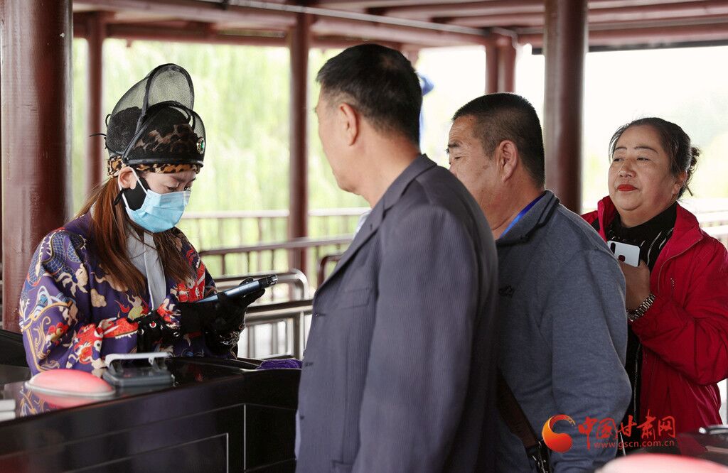 9月22日,記者在嘉峪關(guān)關(guān)城看到前來參觀的游客絡(luò)繹不絕,大家跟隨漢服飄逸的講解員沿著關(guān)城前行。在甕城感受“甕中捉鱉”的境遇,在關(guān)口倒換通關(guān)文牒尋求關(guān)照。一路上都能遇到穿著明朝服飾的工作人員,將人們帶入大明風華的場景之中。