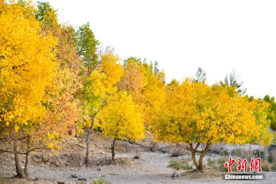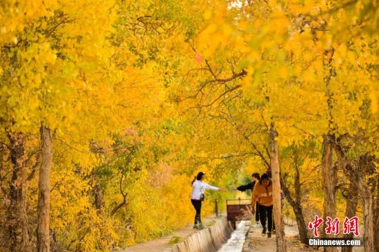 秋風(fēng)漸涼,秋色漸濃,地處絲綢之路黃金旅游段的甘肅敦煌,大漠戈壁上地勢低洼的地方或有河流經(jīng)過的地方,都會有大片大片的原始胡楊林,用金黃色璀璨奪目的色彩展示醉人的秋意,一輛輛車??吭诼愤?,三五成群的游客徒步前往戈壁深處觀賞醉人的胡楊秋色。王斌銀 攝