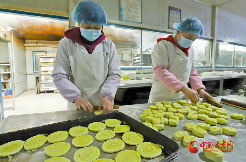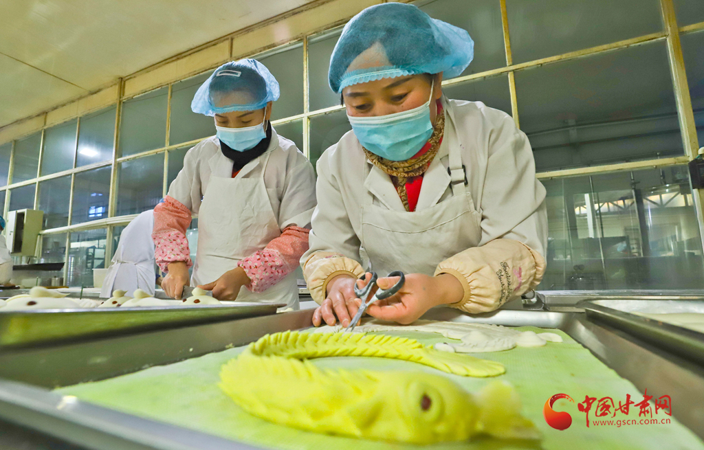 1月6日,甘肅民樂縣隴上鄉(xiāng)村農(nóng)業(yè)科技公司鄉(xiāng)村饃饃加工車間里員工正在精心制作“祥龍花饃饃”。