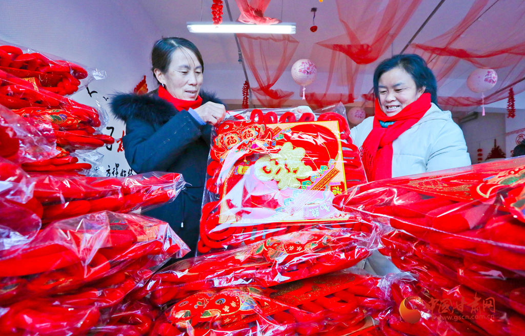 1月6日,甘肅民樂生態(tài)工業(yè)園區(qū)的巾幗扶貧車間內(nèi),女工們在包裝編織好的中國結準備發(fā)運。