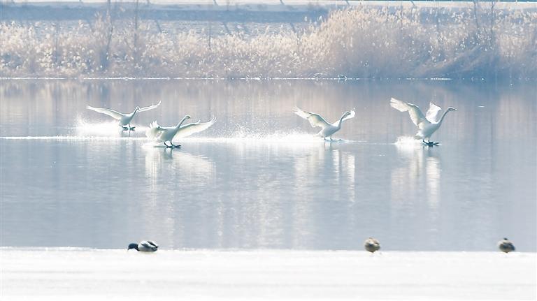 臨夏州永靖縣鹽鍋峽鎮(zhèn)境內(nèi)的黃河八盤峽水庫成為天鵝等候鳥越冬的樂園
