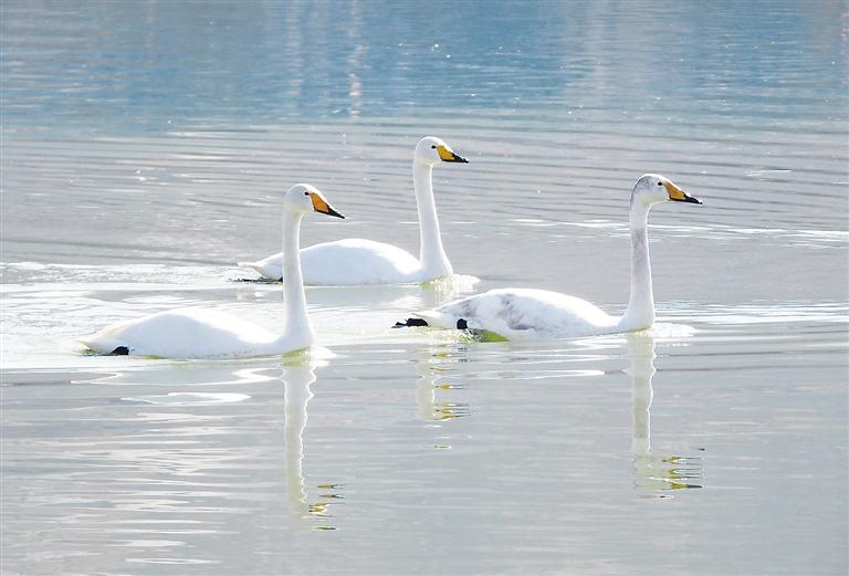 近日,永靖縣鹽鍋峽鎮(zhèn)境內(nèi)的黃河八盤峽水庫成為天鵝等候鳥越冬的樂園,它們?cè)诖藯ⅰ⒁捠?,成為冬日黃河里的一道靚麗風(fēng)景。 本報(bào)記者 史有東 攝