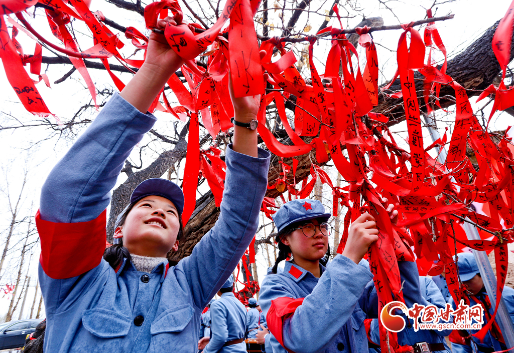 3月31日,甘肅張掖甘州區(qū)龍渠鄉(xiāng)中心學校的師生在紅軍樹上系上心愿紅飄帶,祝愿祖國繁榮昌盛。