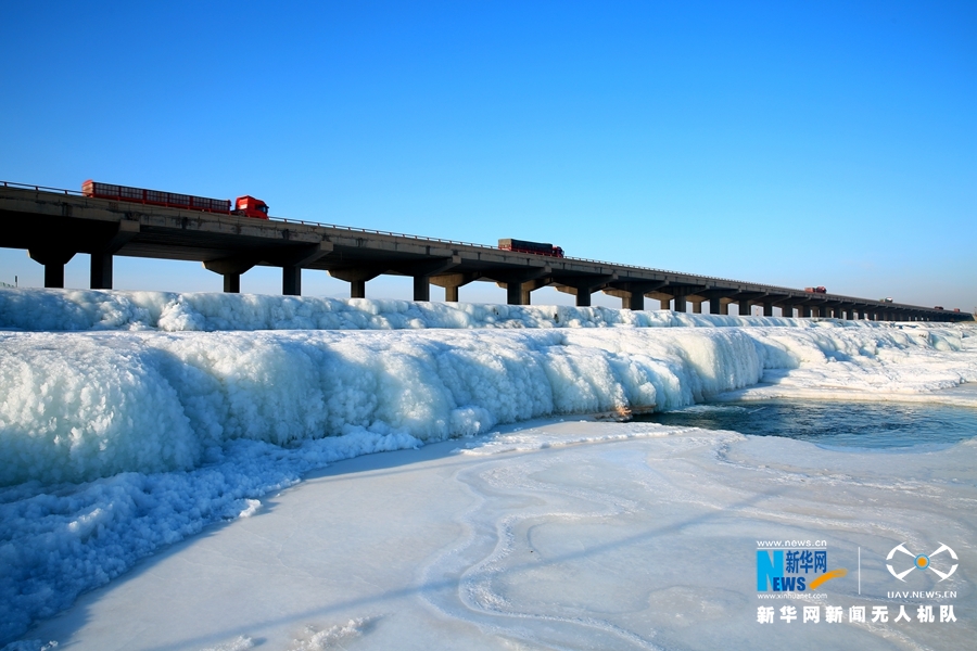 隆冬時(shí)節(jié),流經(jīng)甘肅省張掖市甘州區(qū)的黑河河水結(jié)冰,銀裝素裹,從空中俯瞰如一條白色飄帶蜿蜒。