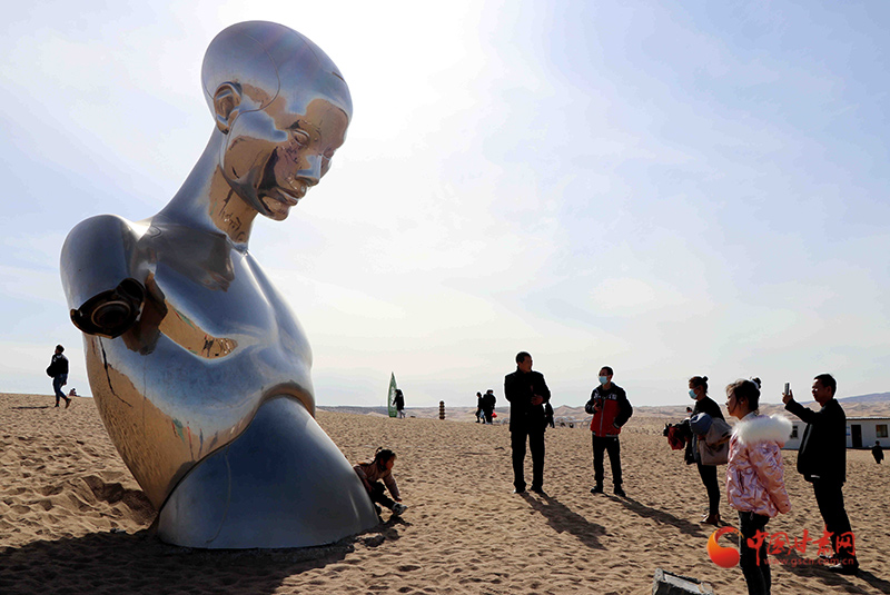 春節(jié)期間,甘肅省民勤縣蘇武沙漠雕塑藝術(shù)主題公園117件不同材質(zhì)、不同風格的雕塑藝術(shù)佳作,高聳在靜謐的蒼穹之下,在茫茫沙漠中,與藍天白云相映成趣,盛迎四海賓朋前來觀光旅游,讓孤寂的沙漠,成為了熱門的“打卡地”。