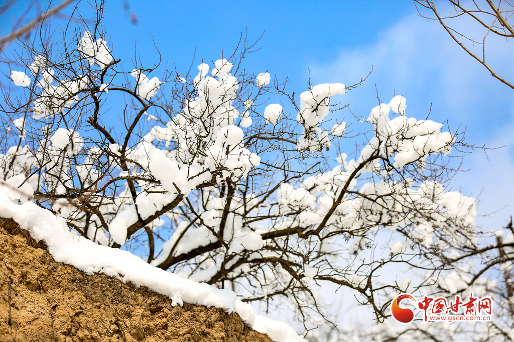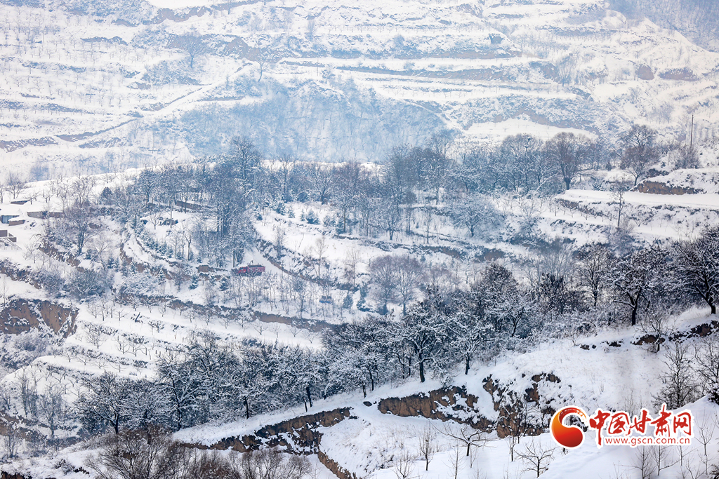 2月8日,雪過天晴,甘肅省平?jīng)鍪徐o寧縣賈河鄉(xiāng)侯山村銀裝素裹,美不勝收。果園、梯田、房屋、公路及遠(yuǎn)山構(gòu)成了一幅天然的鄉(xiāng)村畫卷。