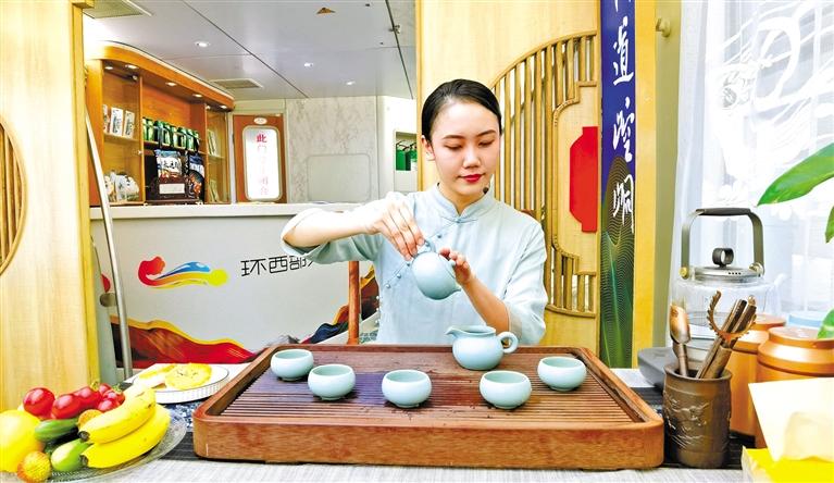 這趟列車由6節(jié)軟臥車廂、1節(jié)餐車、1節(jié)休閑娛樂(lè)功能車組成,車體內(nèi)外隨處可見(jiàn)平?jīng)鑫幕糜卧?。記者在車廂?nèi)看到,崇信龍泉寺、華亭安口窯古村落、靜寧仙人峽……每一間軟臥門上都是絕美的平?jīng)鲲L(fēng)光大片,整個(gè)車體儼然移動(dòng)的“平?jīng)鑫穆谜桂^”,讓人“身未動(dòng),心已遠(yuǎn)”。車體中部的功能車,更是顛覆了以往人們對(duì)火車的認(rèn)知,麻將桌、功夫茶、全套的K歌設(shè)備,還有平?jīng)鎏厣穆蒙唐?、農(nóng)特產(chǎn)品展銷區(qū),平?jīng)鑫穆脮営[區(qū)、平?jīng)鑫幕黝}報(bào)刊欄,足以打發(fā)游客在旅途中的無(wú)聊時(shí)光。餐車也極富特色,車廂頂部裝飾有色彩豐富的藻井圖案,飛天仙子衣袂飄飄、環(huán)繞四周。“在這樣的餐車上吃飯,吃的那是品位。”一位乘客開(kāi)心地和同行的伙伴說(shuō)著。62歲的張女士一到平?jīng)鼍兔Σ坏亟o女兒發(fā)微信,“火車上住得舒適,服務(wù)好,環(huán)西部火車游·崆峒號(hào)很超值!”