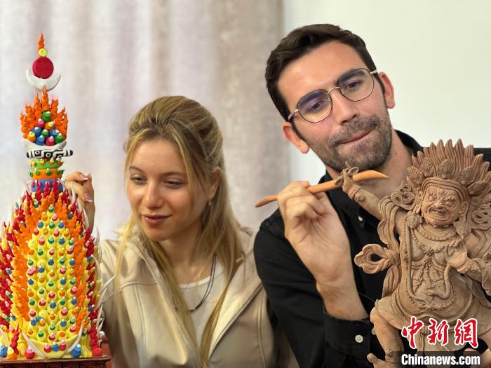 圖為高佑思和露露體驗熱貢藝術。李江寧 攝