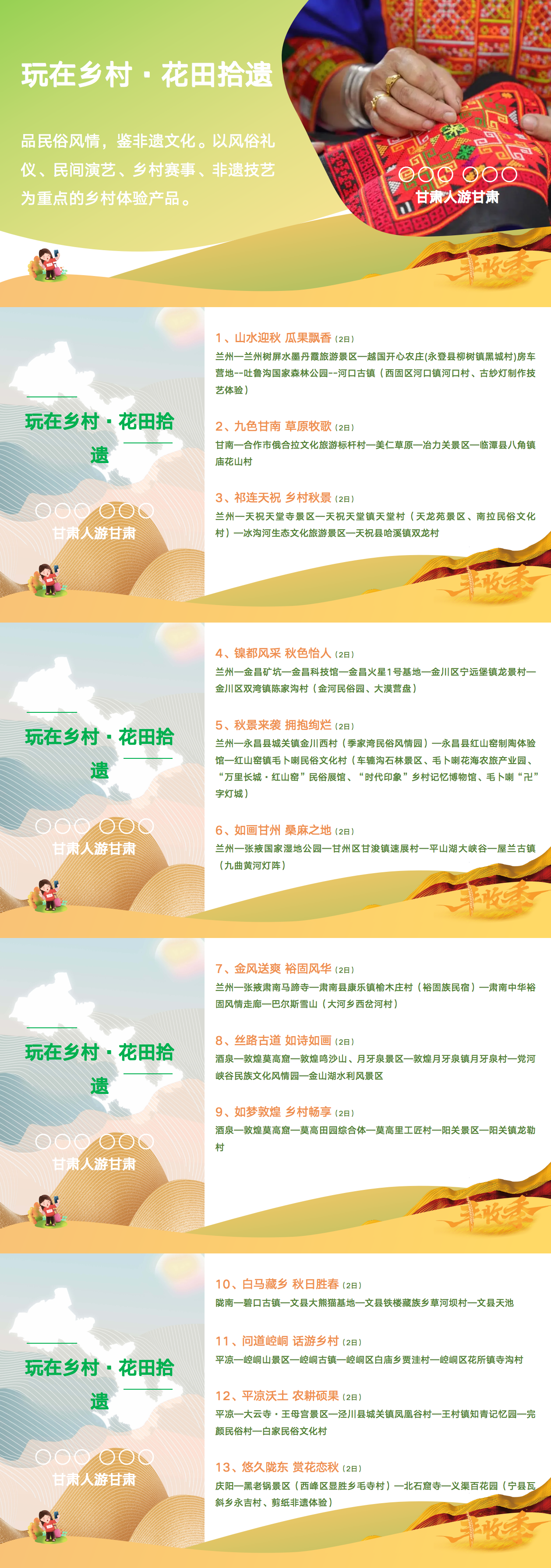 這5大類線路具體包括:游在鄉(xiāng)村·豐收節(jié)慶、玩在鄉(xiāng)村·花田拾遺、悟在鄉(xiāng)村·鄉(xiāng)土新知、品在鄉(xiāng)村·康養(yǎng)鄉(xiāng)居、賞在鄉(xiāng)村·臻味清歡,涵蓋了鄉(xiāng)村觀光、美食、住宿、游玩、體驗、研學(xué)、康養(yǎng)等內(nèi)容,為金秋時節(jié)游客出行提供豐富的選擇,也為甘肅文旅市場聚人氣、促消費提供了重要載體。