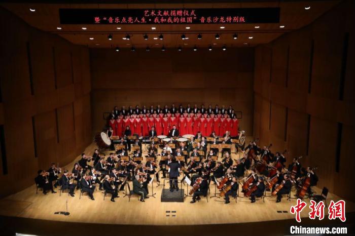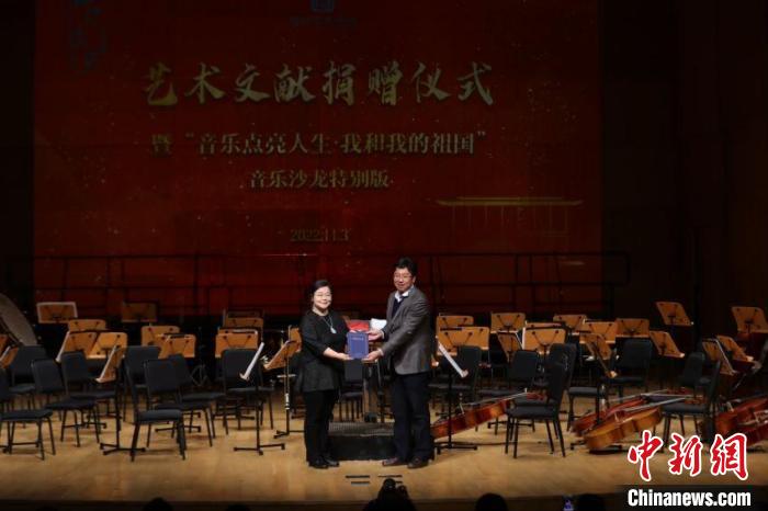 國家圖書館重要藝術(shù)文獻(xiàn)捐贈儀式暨“音樂點(diǎn)亮人生·我和我的祖國——音樂沙龍?zhí)貏e版”活動3日晚在國圖藝術(shù)中心·音樂廳舉辦。國家圖書館黨委書記、副館長魏大威接受捐贈,并為捐贈人代表中央民族歌舞團(tuán)民樂團(tuán)團(tuán)長馬蘭花頒發(fā)捐贈證書。