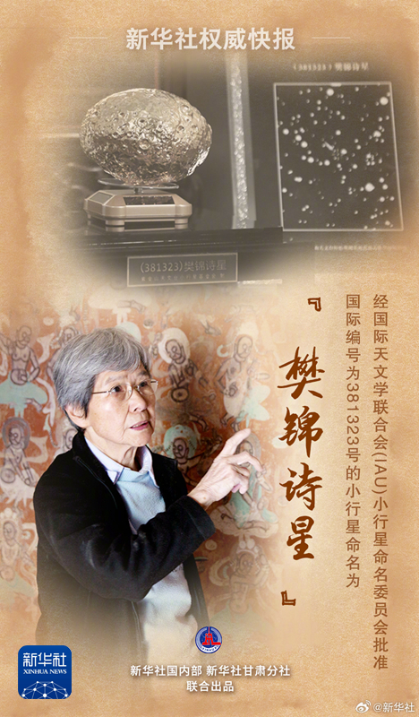 7月10日,樊錦詩從事敦煌文物工作60年座談會在敦煌舉行。會上正式命名了編號381323小行星為#樊錦詩星#。繼向北京大學捐資1000萬元支持敦煌學研究后,樊錦詩再向中國敦煌石窟保護研究基金會捐資1000萬元,用于敦煌文物事業(yè)發(fā)展和急需人才培養(yǎng)。捐款來自樊錦詩所獲獎金及個人積蓄。(記者:張玉潔 施雨岑 張智敏)