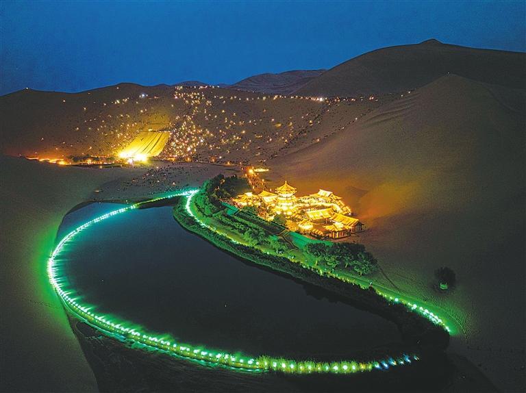 近期,甘肅省敦煌市鳴沙山月牙泉景區(qū)迎來暑期游客高峰。為豐富游客體驗,景區(qū)在夜幕降臨后舉行“點亮敦煌——鳴沙山月牙泉沙漠萬人演唱會”活動。游客們伴著音樂,揮舞點亮的手機唱歌互動,遙望夜幕下的月牙泉,感受別樣的景致。 新華社照片