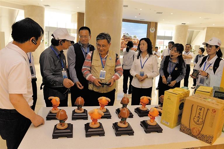 聯(lián)合國教科文組織專家在臨夏地質公園博物館觀看文創(chuàng)產品。