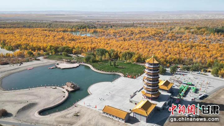 圖為位于金塔南收費(fèi)站入口前,帶有胡楊和古佛塔元素的“天空之鏡”建筑。(無(wú)人機(jī)照片) 九美旦增 攝