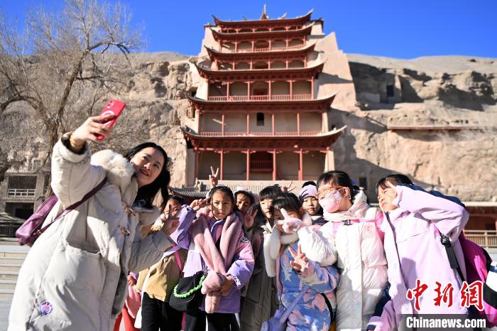 敦煌文化研學(xué)正逐步成為敦煌旅游新時(shí)尚,莫高窟成為“研學(xué)養(yǎng)身養(yǎng)心”的學(xué)堂之一。連日來(lái),中新社記者來(lái)到冬日的莫高窟,沒有了夏日的人聲鼎沸和如長(zhǎng)龍的隊(duì)伍,多了更多青春面孔,穿著絢麗服飾、背著書包的學(xué)生,點(diǎn)綴著沉悶的戈壁土黃色。