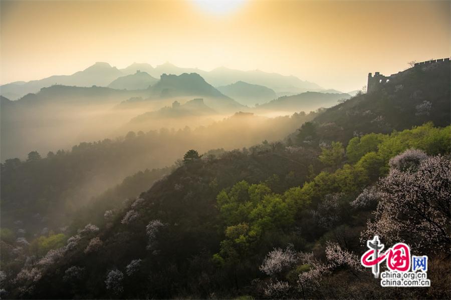 站在金山嶺長城之巔,俯瞰著這片云海和杏花,心中不禁涌起一股豪情。