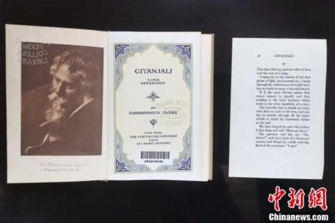 圖為清華大學圖書館收藏的紐約1916年英譯本泰戈爾詩集《吉檀迦利》。中新社記者 易海菲 攝