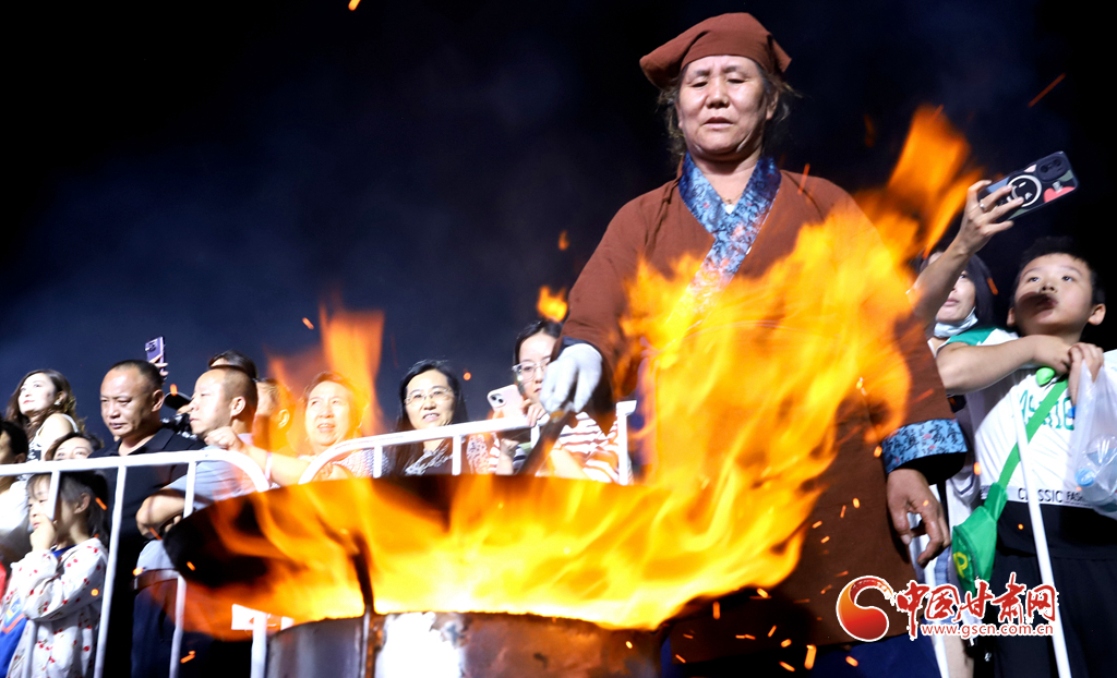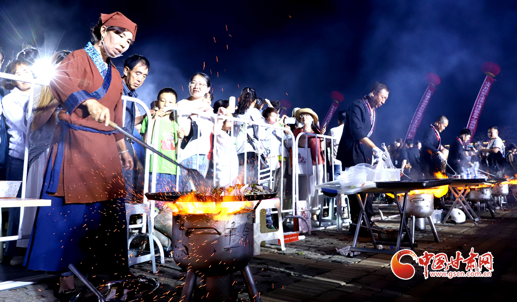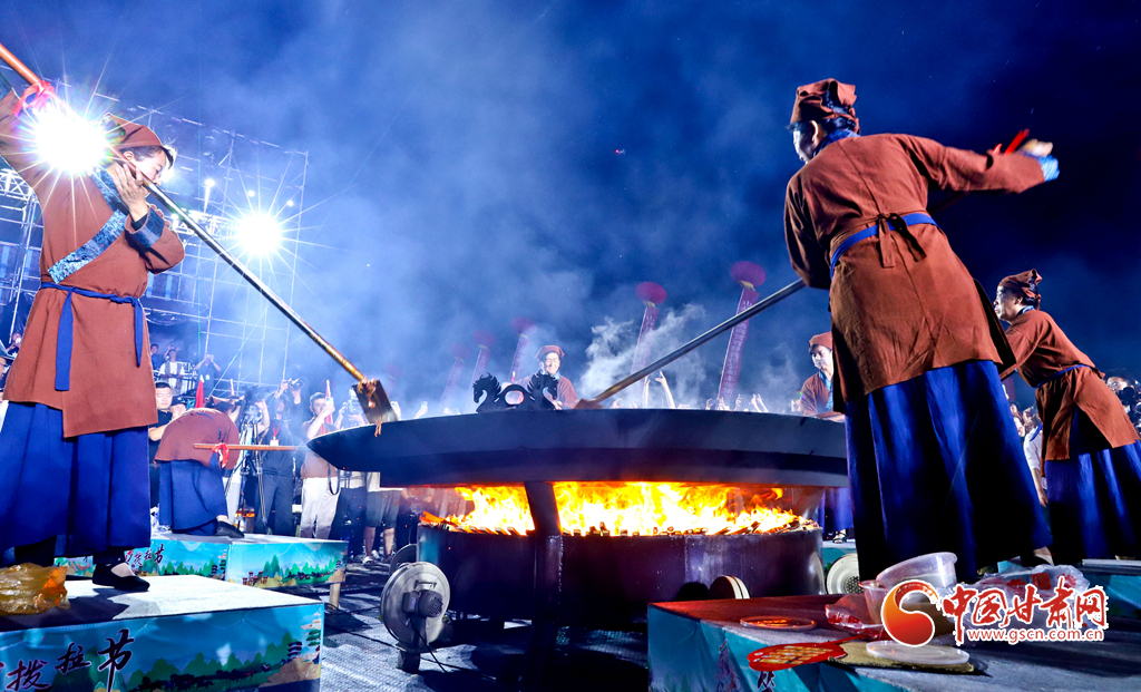 7月13日晚,甘肅省張掖市山丹縣智行廣場(chǎng)上, 一口直徑3.3米的大鏊展現(xiàn)在廣場(chǎng)中央,八名大廚揮動(dòng)著鏟子奮力翻炒,將一碗碗絲路美食炒撥拉呈現(xiàn)在眾多游客面前。