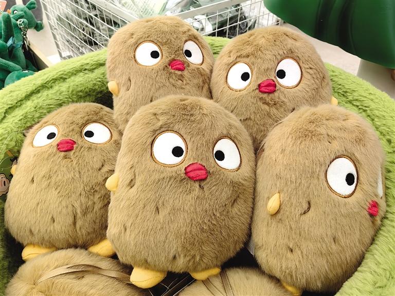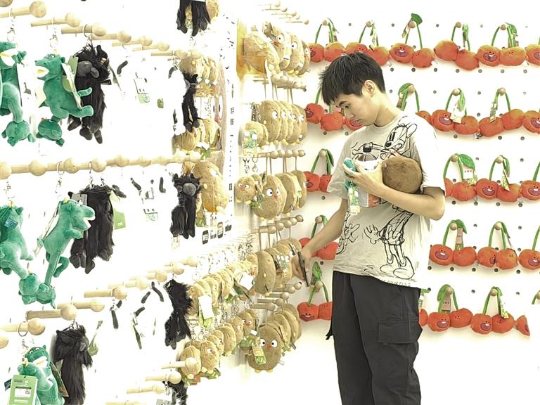 此時,目不暇接的花式文創(chuàng)在店內“爭奇斗艷”,爭當“顯眼包”,等待被主人帶回家。掀開店內一只毛絨收納箱,一窩土豆子撲閃著大眼睛向你眨眼。都說轉角遇到愛,誰料,轉角處粉嘟嘟的“拿捏玩偶娃娃公仔”捏著一個小蓮花花苞在向你招手。一回頭,造型別致的文創(chuàng)飾品精美又時尚,一側的帆布包上印著“別卷我”。就連記者逛下來,都入手兩件文創(chuàng)。