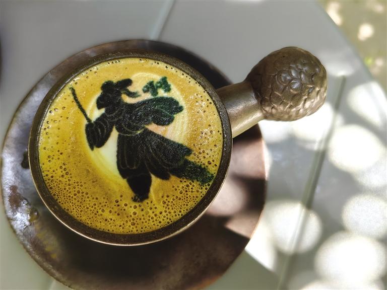 驚喜還有很多,就像店內柜體上的一句話“可以讓大家體會到我們不一樣的用心”,這些年輕人用心起來還真能撬動地球。飲品和咖啡,設計團隊愣是把口味和地域文化結合起來,整出了幾款“限量版”:城市限定——沙橙暴飲品,西北特有;特調咖啡——苦水玫瑰特調,讓人一口難忘之余還配上了臺詞,“苦水玫瑰有點甜”;“文物咖啡”更是占據(jù)“C位”,咖啡拉花機“印制”而成的微縮版銅奔馬、蛙紋罐、銅車馬等文物圖案浮在濃郁的咖啡上,精致、唯美。這還不算,咖啡器皿的名稱也非同尋常——鷹首權杖杯。陶瓷來自景德鎮(zhèn),手柄是省博鷹頭形青銅權杖首的文物原型。驚嘆、贊美、感慨,每一位品嘗之人喜愛之余竟不忍飲用。